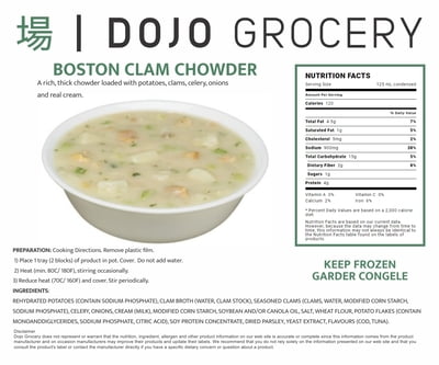 REHYDRATED POTATOES (CONTAIN SODIUM PHOSPHATE), CLAM BROTH (WATER, CLAM STOCK), SEASONED CLAMS (CLAMS, WATER, MODIFIED CORN STARCH, SODIUM PHOSPHATE), CELERY, ONIONS, CREAM (MILK), MODIFIED CORN STARCH, SOYBEAN AND/OR CANOLA OIL, SALT, WHEAT FLOUR, POTATO FLAKES (CONTAIN MONOANDDIGLYCERIDES, SODIUM PHOSPHATE, CITRIC ACID), SOY PROTEIN CONCENTRATE, DRIED PARSLEY, YEAST EXTRACT, FLAVOURS (COD, TUNA).