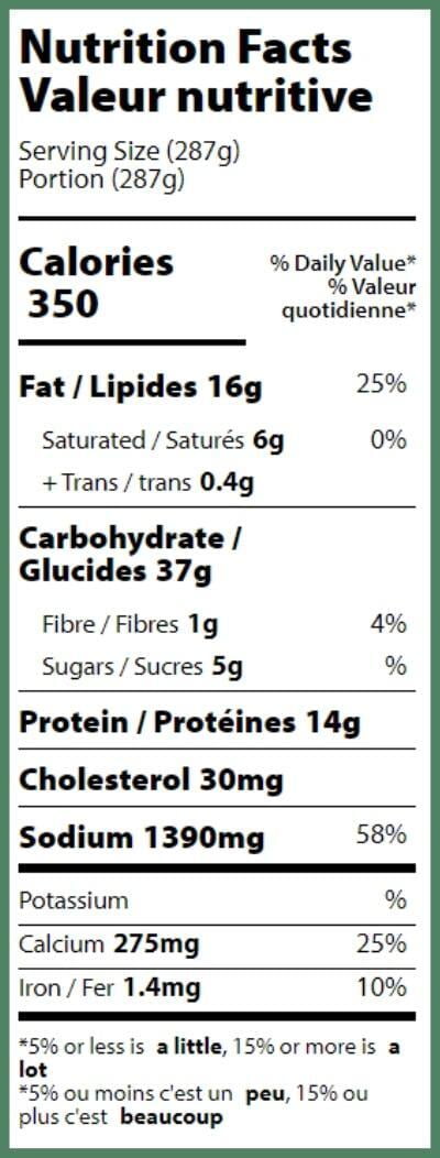 Conventional Oven 400°F / 200°C Frozen: tent lid, heat for 1hr40min. Remove lid heat for additional 20-30min or until cheese browned. Refrigerated: tent lid, heat for 1hr20min, remove lid, heat for additional 15-20min or until cheese browned. Convection Oven 350°F / 180°C Frozen: tent lid, heat for 1hr20min, remove lid, heat for additional 15-20min or until cheese browned. Refrigerated: tent lid, heat for 55min, remove lid, heat for additional 15min or until cheese browned. Steamer Frozen: heat for 1hr30min. Refrigerated: heat for 1hr10min.