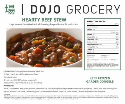 Water, Seasoned Beef (beef, water, modified corn starch, salt, sodium phosphate), Rehydrated Potatoes(sodium phosphate), Carrots, Peas, Beef Flavour (yeast extract), Modified Corn Starch, Canola or Soybean Oil, Enriched Wheat Flour, Sugar, Salt, Onion Powder, Caramel, Dehydrated Garlic and Spice.