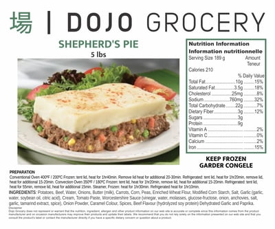 Potatoes, Beef, Water, Onions, Butter (milk), Carrots, Corn, Peas, Enriched Wheat Flour, Modified Corn Starch, Salt, Garlic (garlic, water, soybean oil, citric acid), Cream, Tomato Paste, Worcestershire Sauce (vinegar, water, molasses, glucose-fructose, onion, anchovies, salt, garlic, tamarind extract, spice), Onion Powder, Caramel Colour, Spices, Beef Flavour (hydrolyzed soy protein) Dehydrated Garlic and Paprika.